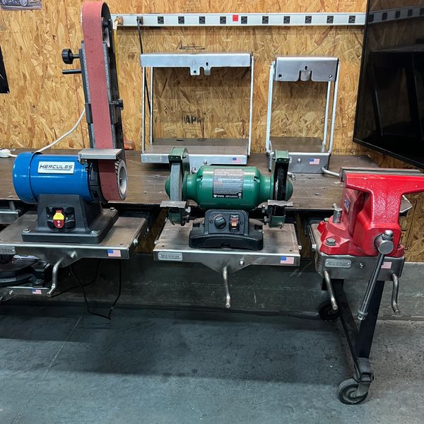 Universal swing up tool platform: Vises, bench grinders, belt sanders, planers, tubing notchers, benders, chop saws and more!
